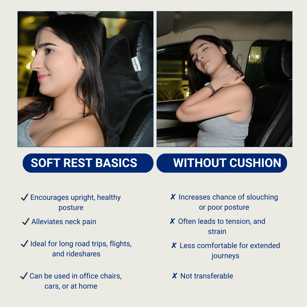 - The Softrest Compact Neck Pillow: Finally, a neck rest that fits just right. Designed to bridge the awkward gap between your neck and the headrest, this compact pillow provides immediate relief from tension. It features a height-adjustable strap system that lets you position the support exactly where you need it, ensuring your cervical spine stays aligned and stress-free.